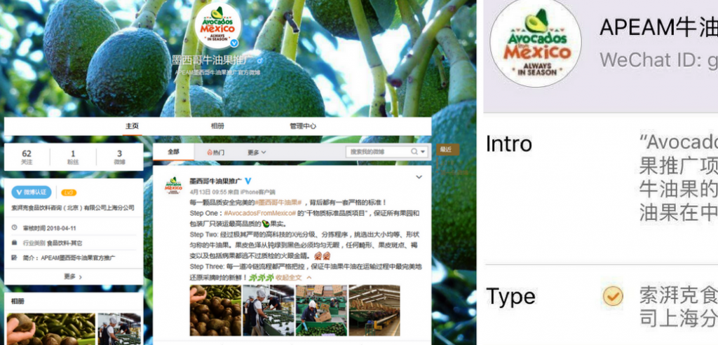 Uruapan, Mich.- Como resultado de sus esfuerzos para promocionar el aguacate mexicano en China, la Asociación de Productores y Empacadores Exportadores de Aguacate de México (APEAM) lanzó, a través de su marca Avocados From Mexico (AFM), las dos primeras cuentas oficiales en Weibo y WeChat, las plataformas de redes sociales y mensajería personal más importantes en el gigante asiático, con el apoyo de la agencia internacional de comunicación y mercadotecnia Sopexa.