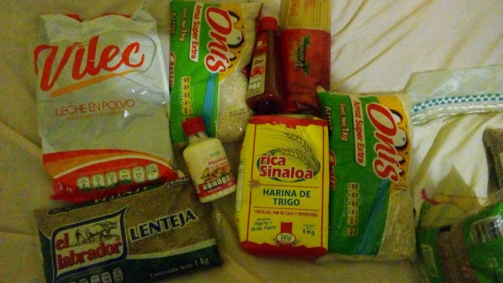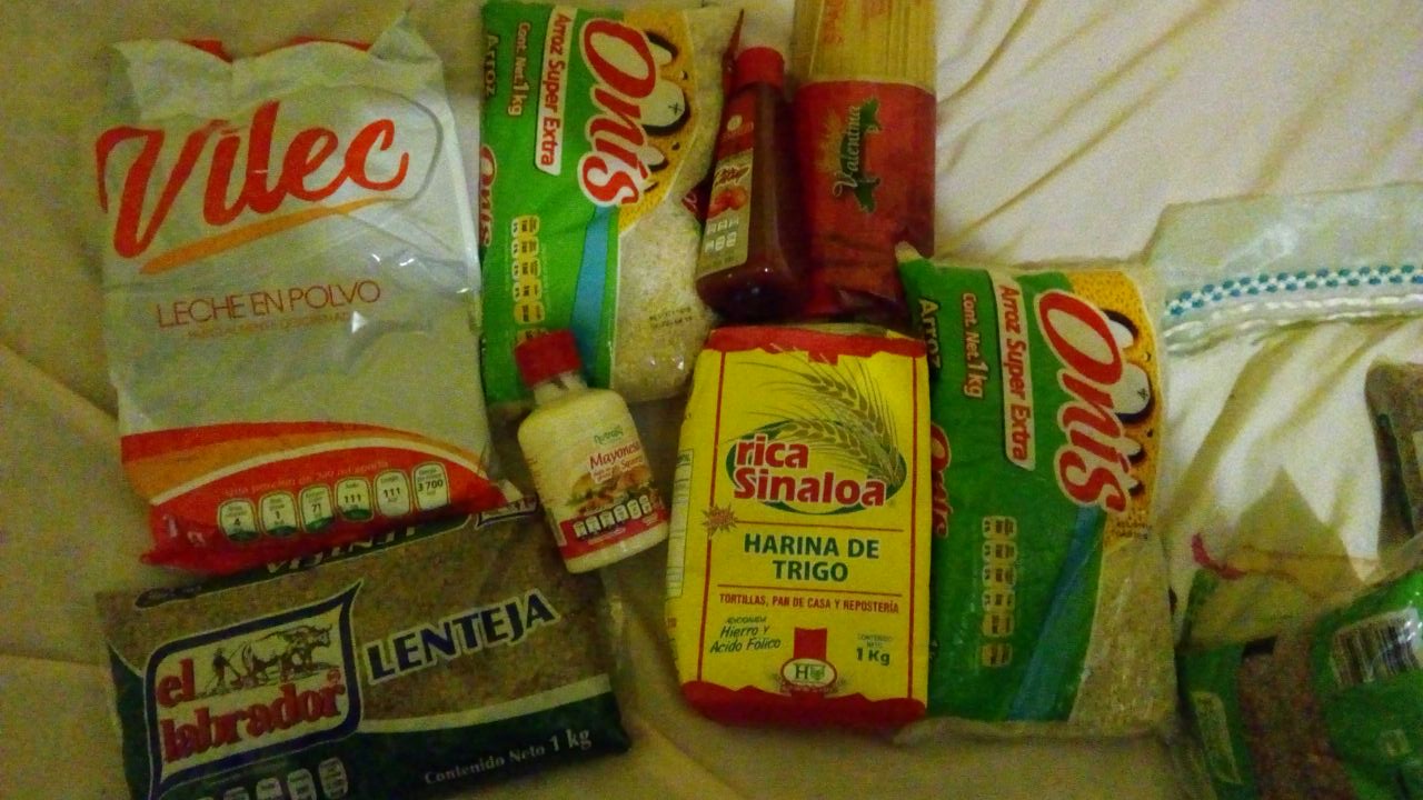 En instantes, automovilistas y habitantes de una comunidad cercana abrieron el contenedor y descubrieron que transportaba cajas de cartón conteniendo las despensas con productos básicos como arroz, frijol, harina, lenteja, leche en polvo, mayonesa y pasta.