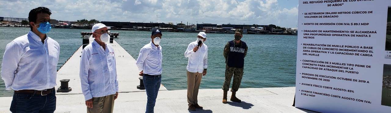 Por otra parte, con inversión pública por 128.8 millones de pesos, durante el presente año se lleva a cabo la rehabilitación de muelles públicos, construcción de 3 muelles en peine y dragado de mantenimiento del puerto de abrigo de Yucalpetén, lo que le permitirá alcanzar una profundidad de menos 3 metros, a fin de incrementar la capacidad operativa y de carga del Puerto (89.1 millones de pesos).