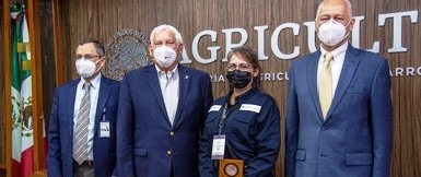 Al encabezar la celebración virtual, el titular de la dependencia federal, Víctor Villalobos Arámbula, entregó un reconocimiento a la médica veterinaria zootecnista Rebeca García Rodríguez, en representación de los 125 oficiales de inspección que han permanecido en servicio desde el inicio de la profesionalización, en 1991.